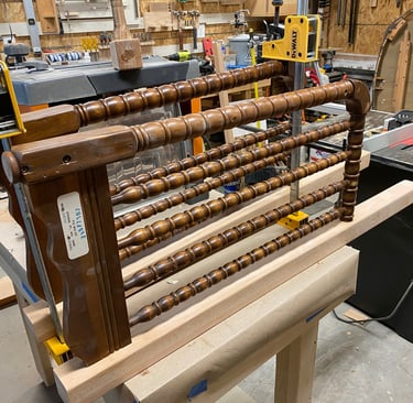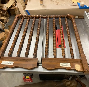 Seat slats were added and the front trim was added with detail that mirrored the trim on the crib. The customer wanted me to preserve scuffs and teething marks so I blended the new by dropping tools on the seat and lightly scuffing and striking vertical elements with a screwdriver.