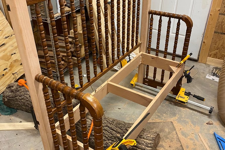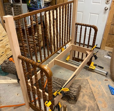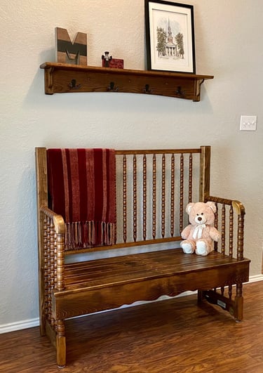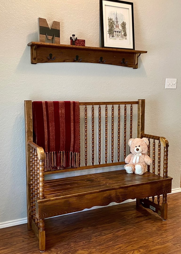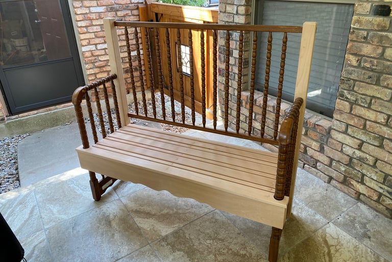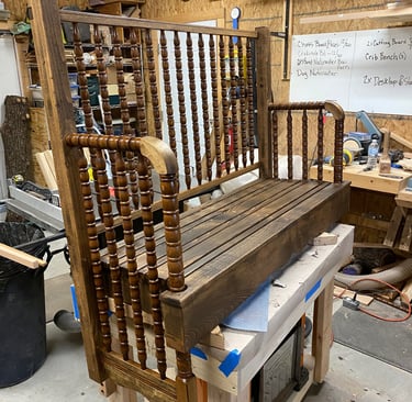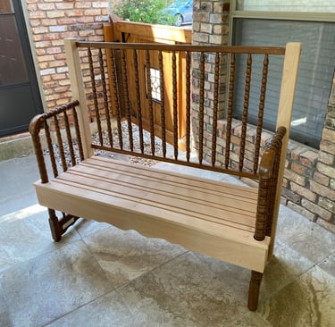A customer asked if I could take her children's crib and convert it into a bench for her grandchildren. This was the firs time I had been asked to repurpose something and this was to be a very special piece for the customer. I accepted and was given complete freedom to create the piece.